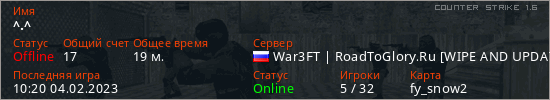 Играет на Counter Strike 1.6 сервере. Страна: РоссияПервый раз замечен 18:52 26.05.2022