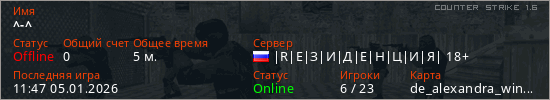 Играет на Counter Strike 1.6 сервере. Страна: РоссияПервый раз замечен 11:44 05.01.2026