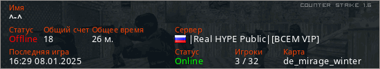 Играет на Counter Strike 1.6 сервере. Страна: РоссияПервый раз замечен 16:10 07.01.2025