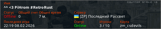 Играет на Counter Strike 1.6 сервере. Страна: УкраинаПервый раз замечен 21:51 08.02.2026