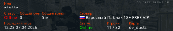 Играет на Counter Strike 1.6 сервере. Страна: РоссияПервый раз замечен 12:11 07.04.2026