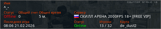 Играет на Counter Strike 1.6 сервере. Страна: РоссияПервый раз замечен 07:33 21.02.2026