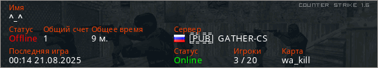 Играет на Counter Strike 1.6 сервере. Страна: РоссияПервый раз замечен 18:38 20.08.2025