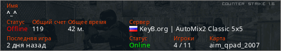 Играет на Counter Strike 1.6 сервере. Страна: РоссияПервый раз замечен 16:39 20.04.2025