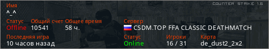 Играет на Counter Strike 1.6 сервере. Страна: РоссияПервый раз замечен 02:11 23.11.2019
