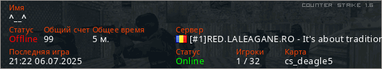 Играет на Counter Strike 1.6 сервере. Страна: РумынияПервый раз замечен 21:20 06.07.2025
