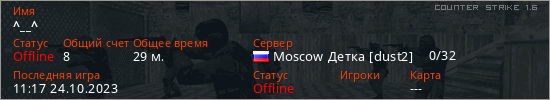 Играет на Counter Strike 1.6 сервере. Страна: РоссияПервый раз замечен 13:34 27.05.2022
