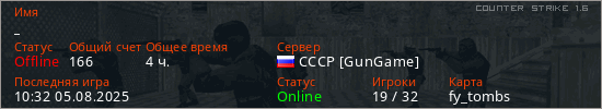 Последний раз был в сети 10:32 05.08.2025 Игрок с таким ником замечен на 47 серверах