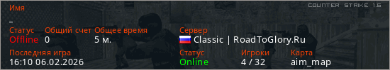 Играет на Counter Strike 1.6 сервере. Страна: РоссияПервый раз замечен 15:24 06.02.2026