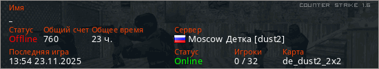 Играет на Counter Strike 1.6 сервере. Страна: РоссияПервый раз замечен 18:43 08.08.2020