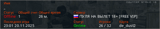 Играет на Counter Strike 1.6 сервере. Страна: РоссияПервый раз замечен 10:47 10.08.2025