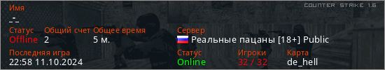 Играет на Counter Strike 1.6 сервере. Страна: РоссияПервый раз замечен 21:40 11.10.2024