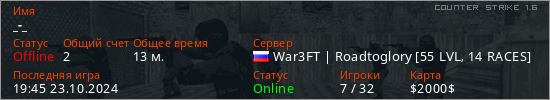 Играет на Counter Strike 1.6 сервере. Страна: РоссияПервый раз замечен 15:00 09.04.2023
