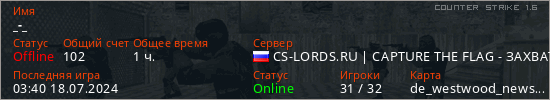 Играет на Counter Strike 1.6 сервере. Страна: РоссияПервый раз замечен 08:03 25.06.2022