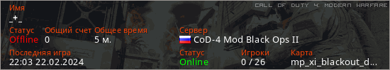 Играет на Call of Duty 4: Modern Warfare сервере. Страна: РоссияПервый раз замечен 22:01 22.02.2024