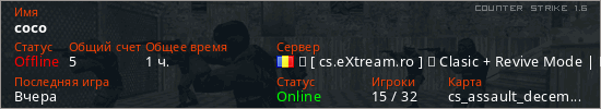 Играет на Counter Strike 1.6 сервере. Страна: РумынияПервый раз замечен 10:46 08.01.2025