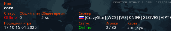 Играет на Counter Strike Global Offensive сервере. Страна: РоссияПервый раз замечен 17:06 15.01.2025