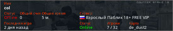 Играет на Counter Strike 1.6 сервере. Страна: РоссияПервый раз замечен 23:35 28.02.2026