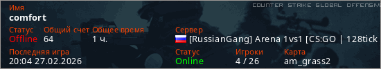 Играет на Counter Strike Global Offensive сервере. Страна: РоссияПервый раз замечен 18:36 18.02.2026