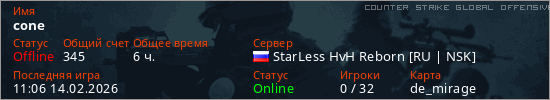 Играет на Counter Strike Global Offensive сервере. Страна: РоссияПервый раз замечен 09:10 12.01.2026