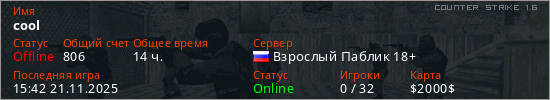 Играет на Counter Strike 1.6 сервере. Страна: РоссияПервый раз замечен 19:12 09.01.2020