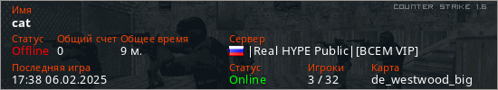 Играет на Counter Strike 1.6 сервере. Страна: РоссияПервый раз замечен 19:19 05.01.2025