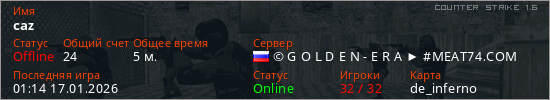Играет на Counter Strike 1.6 сервере. Страна: РоссияПервый раз замечен 01:12 17.01.2026