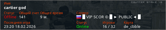 Играет на Counter Strike 1.6 сервере. Страна: РоссияПервый раз замечен 22:54 17.02.2026