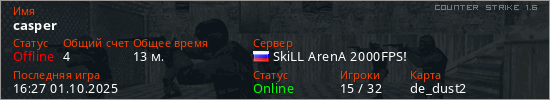 Играет на Counter Strike 1.6 сервере. Страна: РоссияПервый раз замечен 01:57 03.10.2023