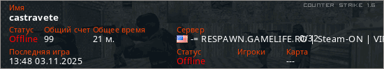 Играет на Counter Strike 1.6 сервере. Страна: СШАПервый раз замечен 14:50 14.03.2025