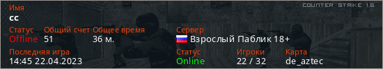 Играет на Counter Strike 1.6 сервере. Страна: РоссияПервый раз замечен 12:16 23.03.2023