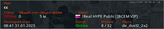 Играет на Counter Strike 1.6 сервере. Страна: РоссияПервый раз замечен 08:39 31.01.2025