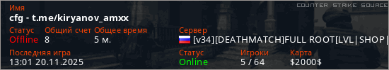 Играет на Counter Strike Source сервере. Страна: РоссияПервый раз замечен 12:44 20.11.2025