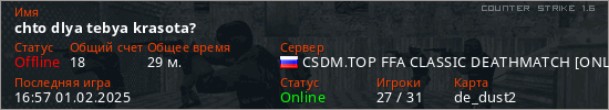 Последний раз был в сети 16:57 01.02.2025 Игрок с таким ником замечен на 14 серверах