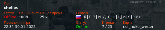 Играет на Counter Strike 1.6 сервере. Страна: РоссияПервый раз замечен 19:33 14.01.2022