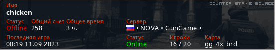 Играет на Counter Strike Source сервере. Страна: РоссияПервый раз замечен 22:01 05.09.2022
