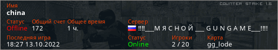 Играет на Counter Strike 1.6 сервере. Страна: РоссияПервый раз замечен 21:15 12.10.2022