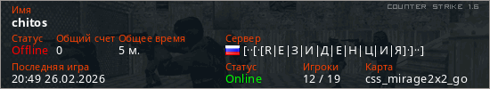 Играет на Counter Strike 1.6 сервере. Страна: РоссияПервый раз замечен 20:43 26.02.2026