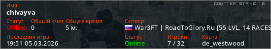 Играет на Counter Strike 1.6 сервере. Страна: РоссияПервый раз замечен 19:38 05.03.2026