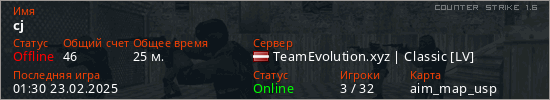 Играет на Counter Strike 1.6 сервере. Страна: ЛатвияПервый раз замечен 00:57 23.02.2025