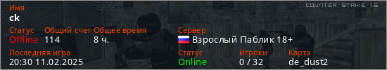 Играет на Counter Strike 1.6 сервере. Страна: РоссияПервый раз замечен 14:06 26.11.2019