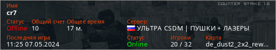 Играет на Counter Strike 1.6 сервере. Страна: РоссияПервый раз замечен 16:22 14.04.2024