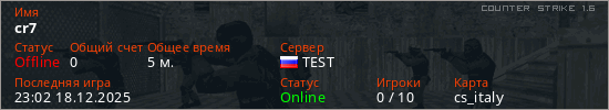 Играет на Counter Strike 1.6 сервере. Страна: РоссияПервый раз замечен 22:52 18.12.2025