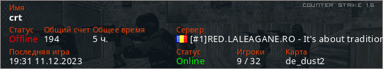 Играет на Counter Strike 1.6 сервере. Страна: РумынияПервый раз замечен 19:20 03.10.2022