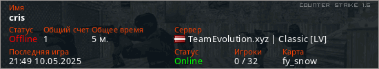 Играет на Counter Strike 1.6 сервере. Страна: ЛатвияПервый раз замечен 21:47 10.05.2025