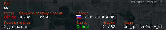 Играет на Counter Strike 1.6 сервере. Страна: РоссияПервый раз замечен 07:30 20.09.2023