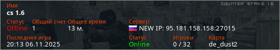 Играет на Counter Strike 1.6 сервере. Страна: РоссияПервый раз замечен 20:26 05.11.2025