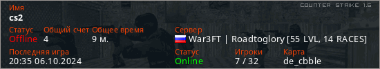 Играет на Counter Strike 1.6 сервере. Страна: РоссияПервый раз замечен 13:54 24.06.2024