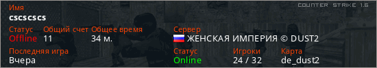 Играет на Counter Strike 1.6 сервере. Страна: РоссияПервый раз замечен 18:35 14.03.2026