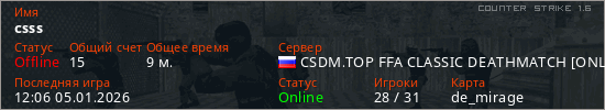 Играет на Counter Strike 1.6 сервере. Страна: РоссияПервый раз замечен 11:00 05.01.2026